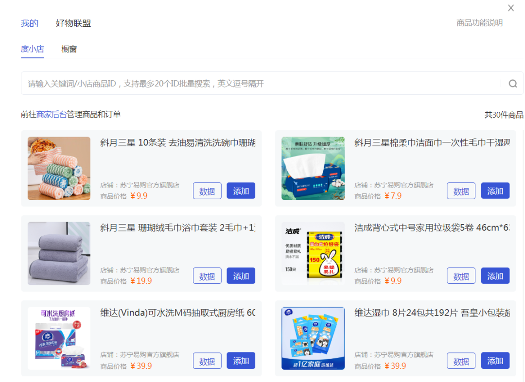 值得注意的是,百度打通了商品库和数字人剧本功能,我们可以直接从度小店、橱窗中添加商品。如果新商家暂时还没有自己的货品,还可以直接联通好物联盟,带货赚取佣金。
