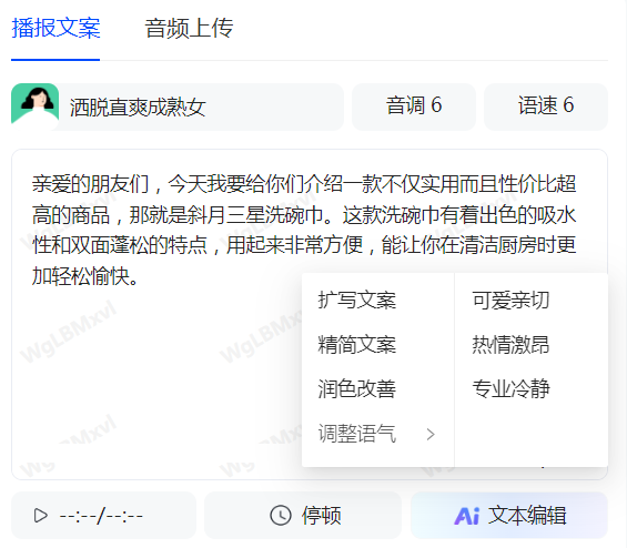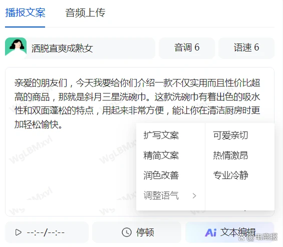 值得注意的是,除了根据产品生成剧本和产品介绍文案之外,在每个单独的分镜中,我们都可以进行更细致的文案扩写、文案精简、文本润色、语气调整等功能。这功能均由AI文本编辑帮忙实现,测试发现,此处的文本生成速度很快,一般在10秒以内就能完成文本扩写等相应操作。