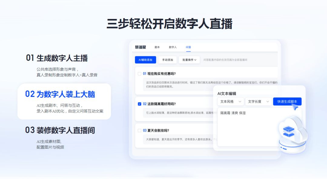 具体来看,慧播星的AI能力,体现在剧本和问答,这两大核心功能中。和制作数字人一样,在剧本功能中,平台实现了一键生成直播剧本的能力。