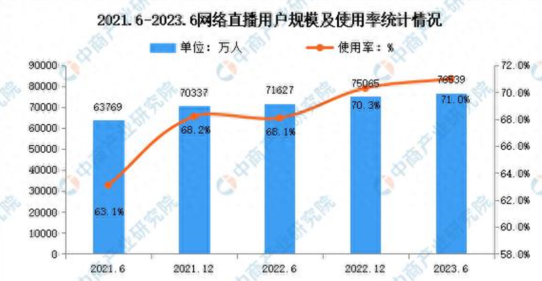 数据显示,截至2023年6月,我国网络直播用户规模达7.65亿人,其中,电商直播用户规模为5.26亿人。