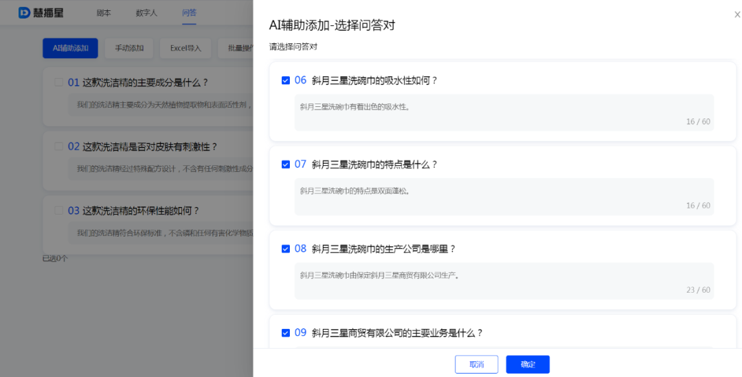 慧播星针对这个场景单独设置了问答界面设置,具体功能包括手动添加、Excel导入以及AI辅助添加。