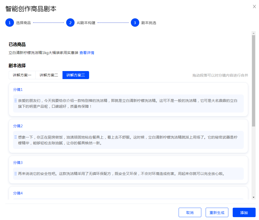 一键添加商品后,平台自带的AI智能创作能力,就可以为不同的商品,提供不同角度、不同场景的直播分镜设计。智能生成的效率很高,一款产品的剧本构建,大约3分钟就可以完成。