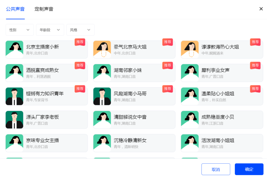 商家可以根据数字人的形象,以及自己的设想,进行不同人物音色的配置。在公共声音库中,平台提供了超100种不同年龄、不同方言、不同风格的音色以供选取。