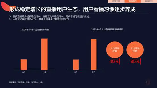 随着用户生态和主播生态的同步完善,百度直播通过分享、提问、连麦等多维度互动建立了用户与主播的联系。数据显示,从2020年8月到11月间,百度直播的人均互动次数增长46%,其中人均评论次数增速达95%。
