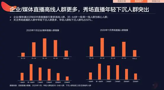 随着百度直播内容的多元化,关注人群也呈现出明显的分化趋势,泛知识内容直播吸引更多35-44岁之间的一线/新一线城市用户;关注秀场直播的用户中,年轻下沉用户更多,年轻人群和下沉人群占比均占50%。由此可见,百度直播内容同时满足不同年龄段和不同地区的用户需求。