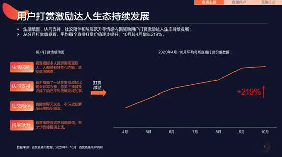 高质量的直播内容和主播用户之间的深度互动,也让百度直播的生态更加完善,以主播打赏为例,从2020年4月-10月,平均每场直播打赏价值增长了219%。报告指出直播内容满足了用户生活破圈、认同支持、社会陪伴和阶层跃升等多种情感诉求,体现了百度直播丰富的内容生态和良好的内容质量。