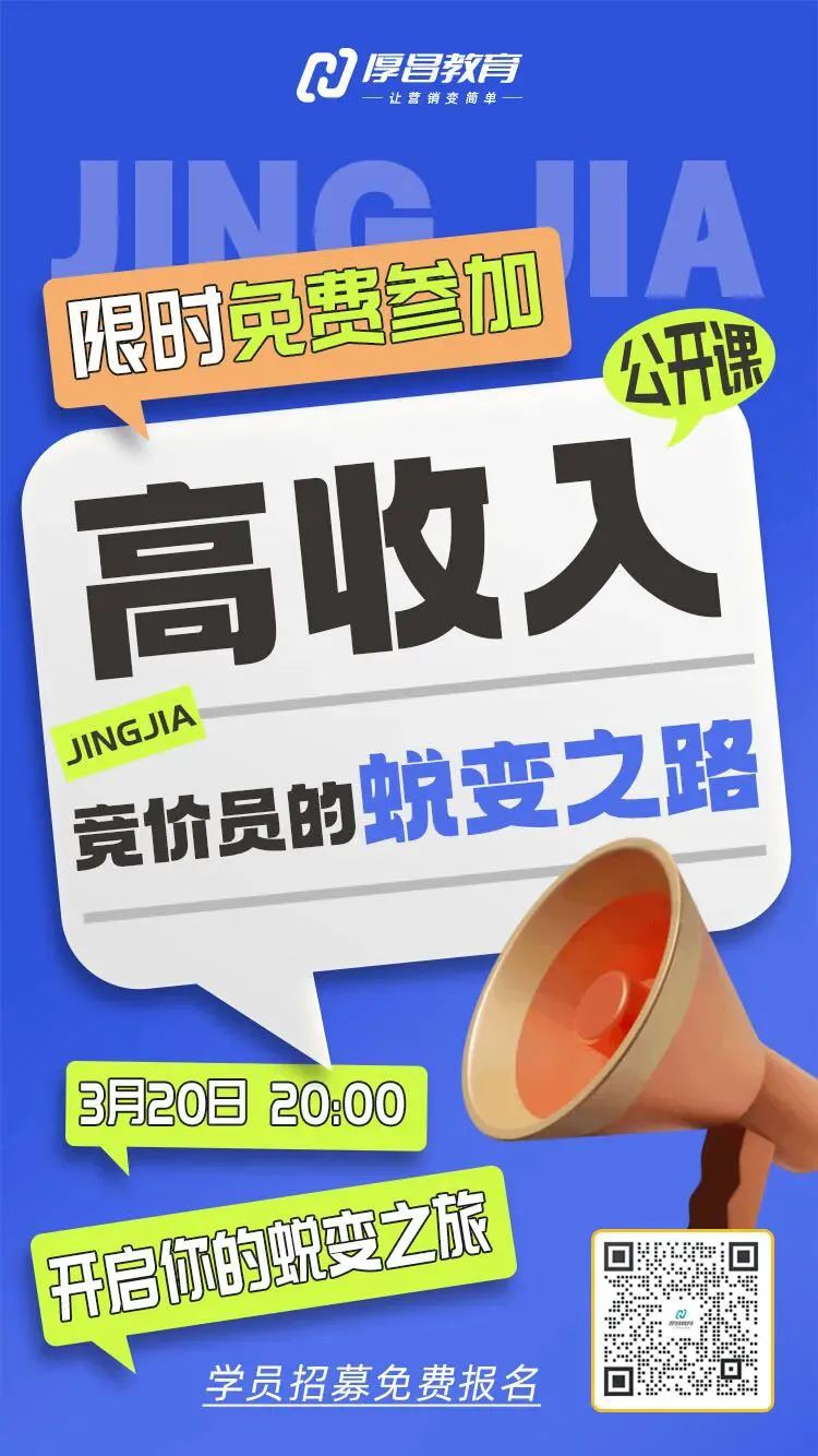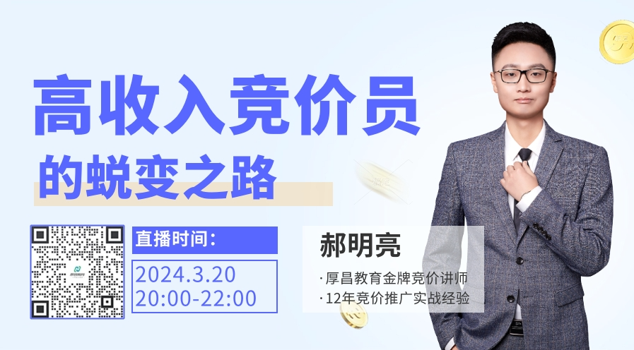 今晚郝明亮老师一场主题为《高收入竞价员的蜕变之路》的免费公开课,整场围绕竞价员不同阶段常见误区与提升方向,以及如何让自己成为更值钱的竞价员的方向进行分享,感兴趣的朋友可以直接扫码联系助理报名。
