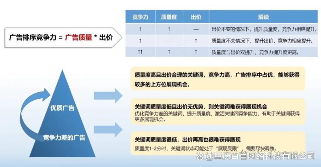 百度竞价广告排名的高低是广告竞争力的体现,由广告的出价和质量共同决定,想要提升广告竞争力,一是提高出价,二是提高广告质量。那么,我们如何实现低价抢排名呢?