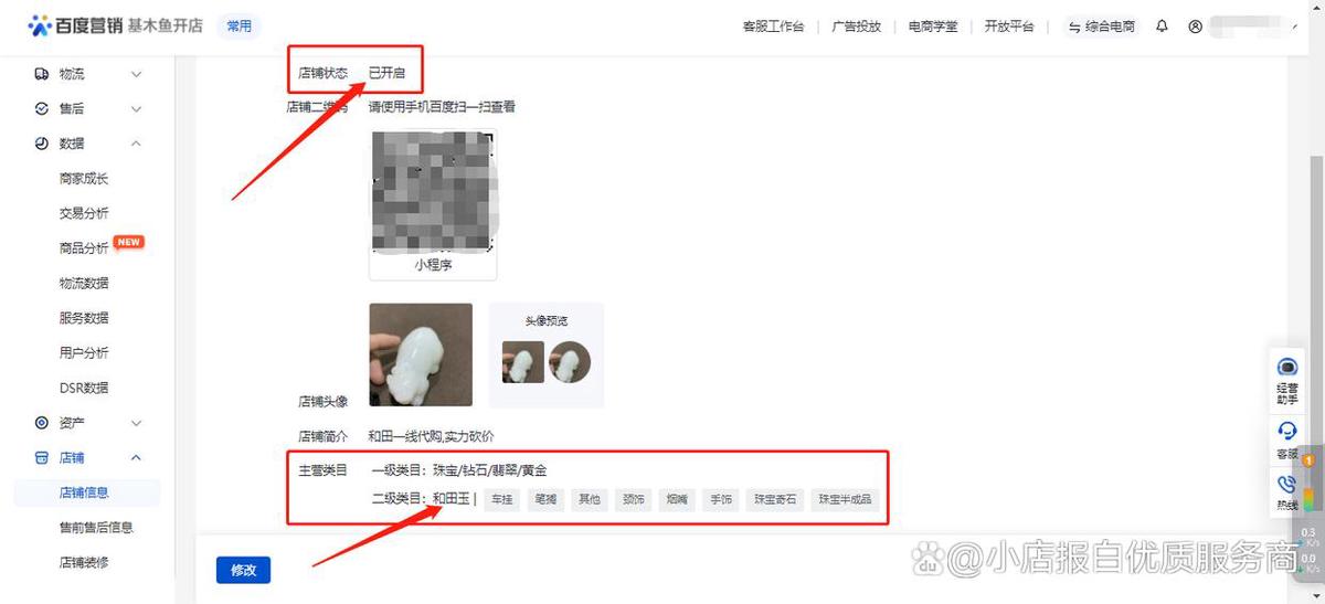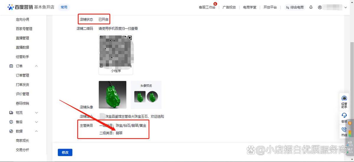 第四步:报白服务商提交报白成功后,店铺后台就可以直接选择珠宝玉石类目,比如和田玉翡翠之类的,然后提交审核,最快一个小时就可以通过,以下图报白成功的和田玉&翡翠为例。