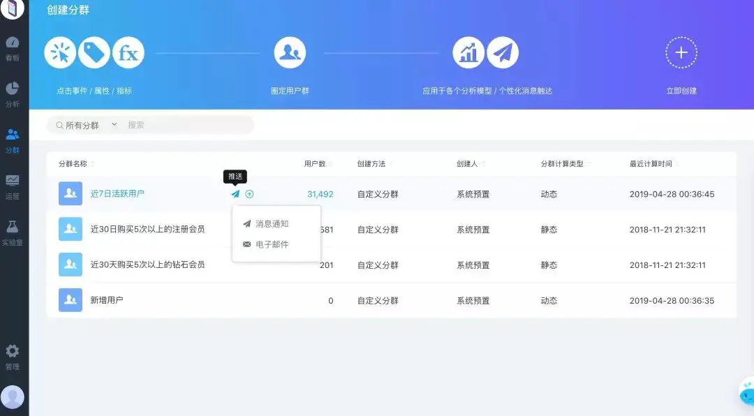 同时,可以对这部分注册用户进行单独分群,单独的分群有利于针对性的精准营销,比如群发邮件、短信、以及APP站内消息。