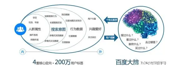 百度基于其AI技术,深挖AI大脑,将信息精准定位给意向人群,通过人群属性,搜索一如,行为数据,兴趣爱好,个性化的推荐给网民