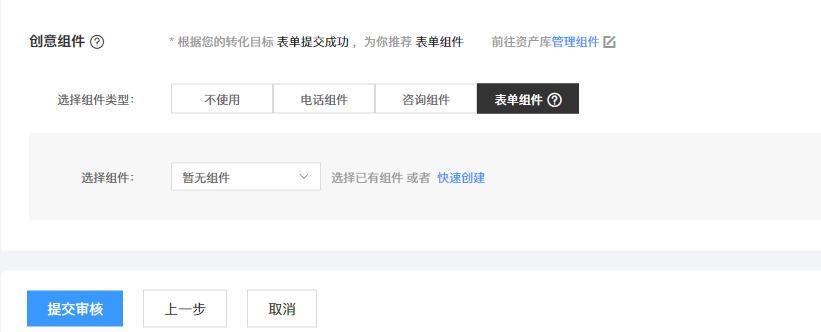 4.创意组件最后就是创意组件了,创意组件可以选择多种类型,如电话组件,咨询组件,表单组件。这里如果需要添加组件可以选择管理组件或者下方选择快速创建需要的组件效果。