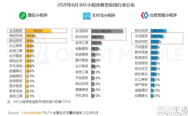 并且在这份《报告》中指出,各平台小程序的特色各不相同,其中微信小程序类型更为丰富、且能够实现社交裂变;支付宝小程序则更多出现在“消费+金融”场景,并有着丰富的线下场景;而百度智能小程序则依托于“信息流+搜索”、并提供开源平台,其视频类小程序使用率更高。