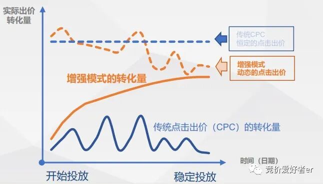 以上的示意图只能作为参考,因为行业不同,受众不同,以及市场需求环境等因素,采用的增强模式的效果也会不同。增强模式是点击出价的智能强化版, 如果转化数据较为稀疏,直接使用转化出价难以达到成本平稳。使用增强模式能结合点击出价和转化出价的优势,系统基于利用全链转化数据,动态微调点击出价,在整体转化成本平稳情况下,增加实际转化量,同时在一段时间内,点击价格会存在一定范围内的波动。此时,各位童鞋要有“过硬”的心理素质,切勿因为短时间点击价格高而去频繁调整计划,建议观察2~3天,如果计划能稳定了转化量,如果转化成本在接受的范围内,尽量不要去干预计划,让它畅快的跑即可,如果不能稳定转化量,且点击出价波动依旧很大,可暂停,后续从创意、落地页上优化,再新上计划测试下。