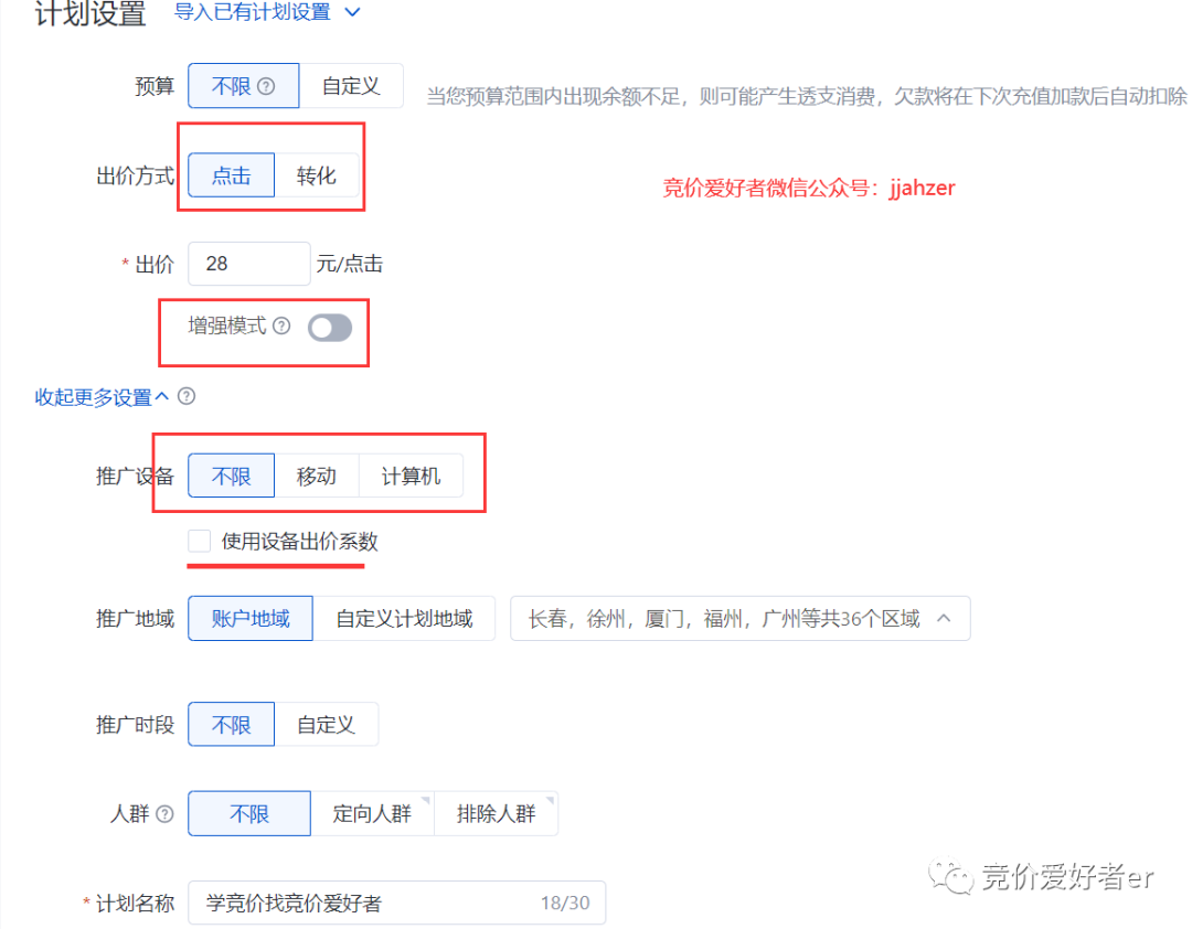 1.2 推广设备在点击更多设置后展开,并默认为“不限”,支持设备出价系数,但如果单选“移动”或者“计算机”表示只投放当前选定的设备,不在支持设备系数设置;