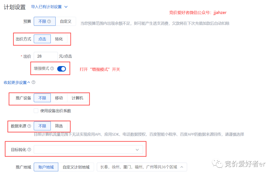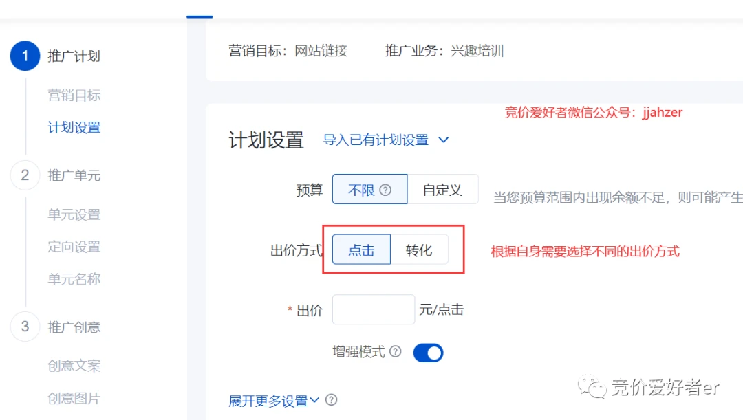 1.1出价方式选择“点击”,且开启“增强模式”开关,代表选择增强模式(原eCPC)出价;