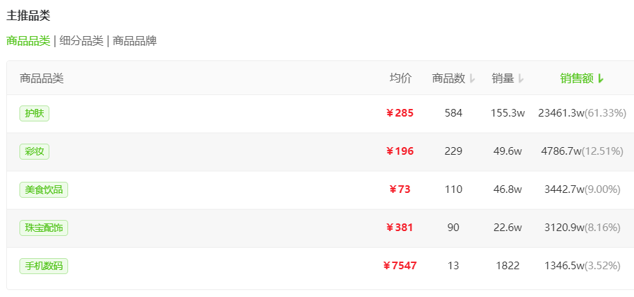 之所以能突破重围,一方面得益于朱梓骁的“勤奋”深耕,Q1季度他直播了56场,平均一周4场,仅次于主持人曹颖;另一方面与朱梓骁找到优势细分赛道不无关系,相较其他主播较为平均的销售额品类占比,朱梓骁在美妆护肤品类的优势极为突出。飞瓜数据显示,朱梓骁的主推产品中,护肤和彩妆品类的销售额占总体销售额的70%以上。