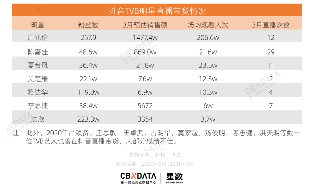 根据星数不完全统计,2020年下半年至今,至少有超过20位TVB艺人陆续成为带货主播。从温兆伦、吕颂贤、李思捷等大众耳熟能详的中年演员外,不乏庄思敏、陈嘉佳等新生代青年演员。从成绩上来看,温兆伦和陈嘉佳分别凭借在服饰品类和食品品类的亮眼表现,在抖音平台占据了一席之地,有部分演员则已经暂停了直播事业。