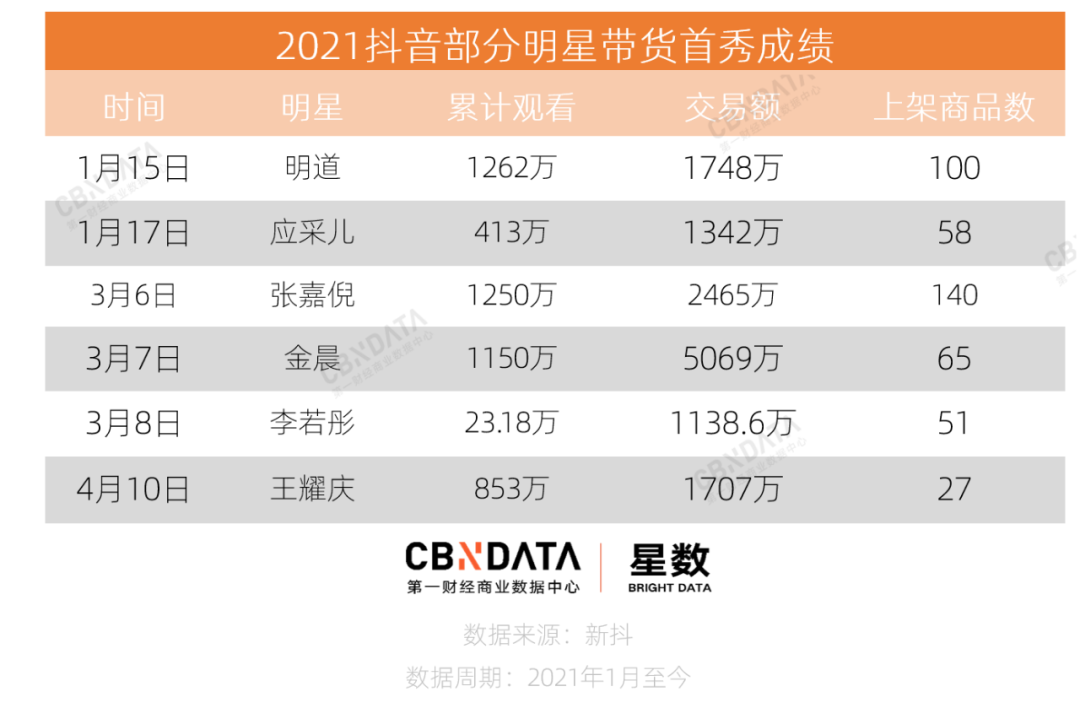 抖音、快手等短视频平台,则仍有不少新面孔以“首秀”的方式尝鲜。以抖音为例,星数发现今年以来每月仍有一些知名明星出现在直播间,如4月的王耀庆,3月的金晨、张嘉倪等等。