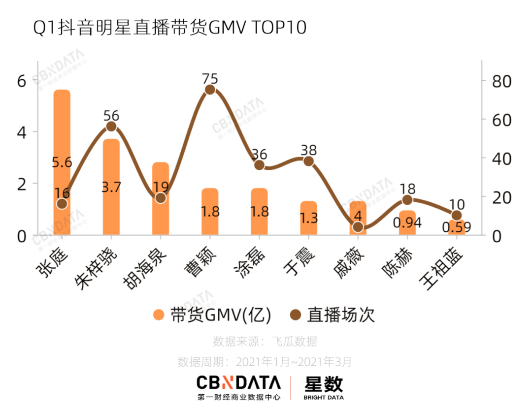 此外,抖音上明星主播的排位也有了些出乎意料的变化。星数整理了Q1季度明星直播带货销售额TOP10发现,张庭依然是抖音带货“一姐”,而一度是明星主播龙头的陈赫已退居后位。抖音粉丝仅500多万的演员朱梓骁Q1季度销售额高达3.7亿,已经超越胡海泉、曹颖等前辈,跃居抖音带货顶流之列。