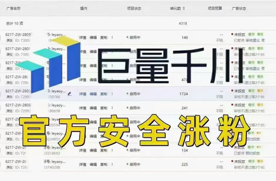 你是否也羡慕过那些几天内粉丝暴涨的账号?你是否也疑惑,为什么别人的内容不比你精彩,粉丝却比你多得多?这背后,很可能隐藏着一个强大的“助推器”——巨量千川。今天,我们就来彻底拆解这个“涨粉核武器”,(千川代投增粉咨询:ye15527649518)用真实逻辑和案例,告诉你如何科学地“买”来真粉丝。