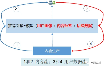 - 详细描述:根据用户的过往行为历史,来尝试识别用户的兴趣,然后从全体内容池中,筛选出和该画像匹配程度最高的内容,推荐给用户,并收集用户对此的反馈数据,来迭代用户的兴趣画像...,如此不断循环迭代...