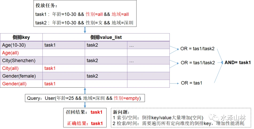 - 用户query:缺省的画像维度,补齐为empty。用户的empty维度,仅能匹配上该维度为all的投放任务