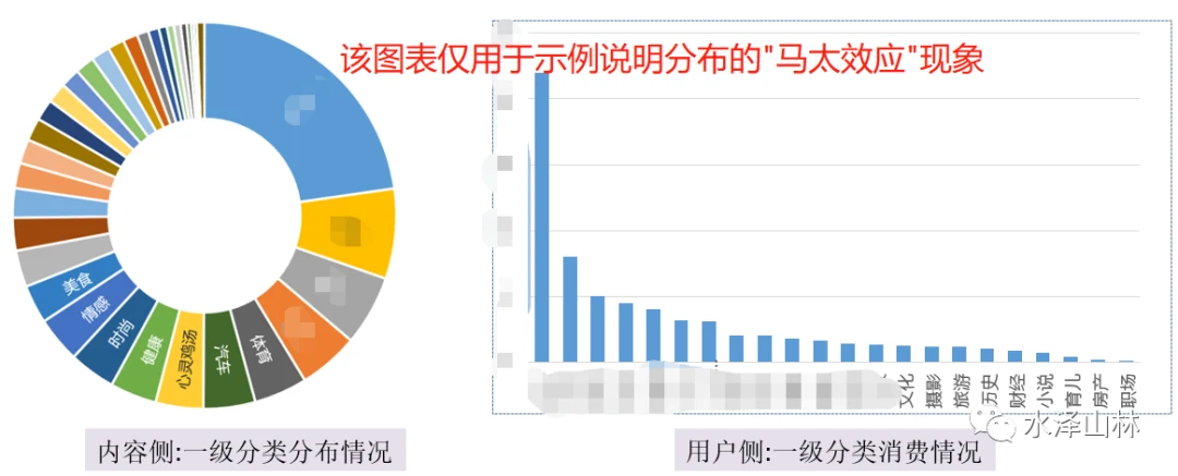 - 在内容侧,数百万级的内容池中,可能Top20%的一级分类内容数量占了整个内容池的80%左右(哦,2/8?3/7?请不用太过纠结,仅随意构造用于示例说明,下同);