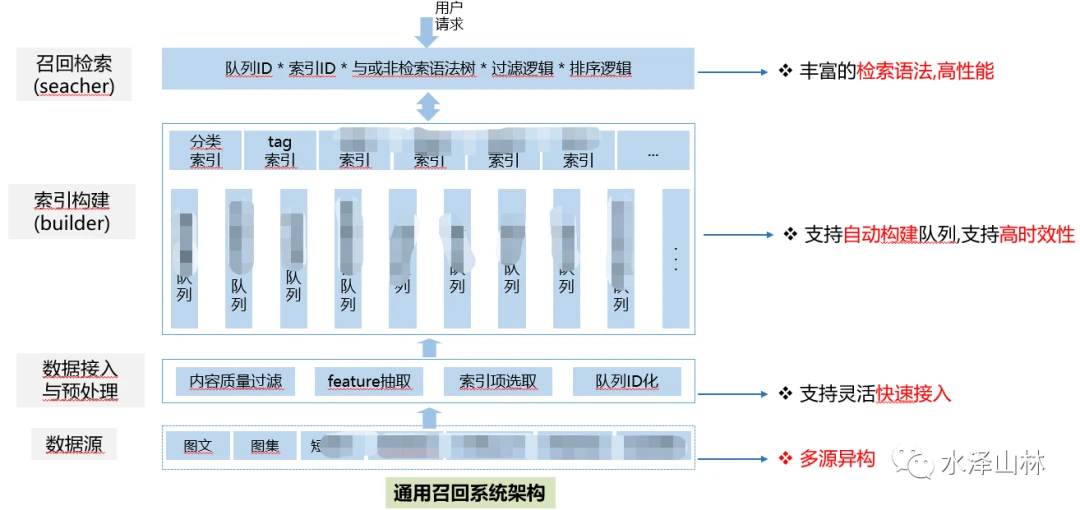 定向召回的基本流程和架构,与常规的推荐召回是一致的,包括数据源接入、数据预处理、离线索引构建、在线检索等4个主要部分。架构图如下: