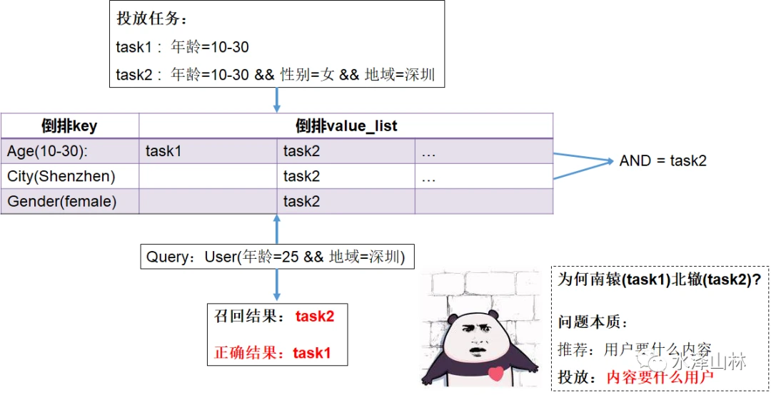 值得注意的是,在具体实现上,传统的倒排索引方式,无法直接满足定向召回的需求。其根本原因在于,推荐与投放是有本质区别的: