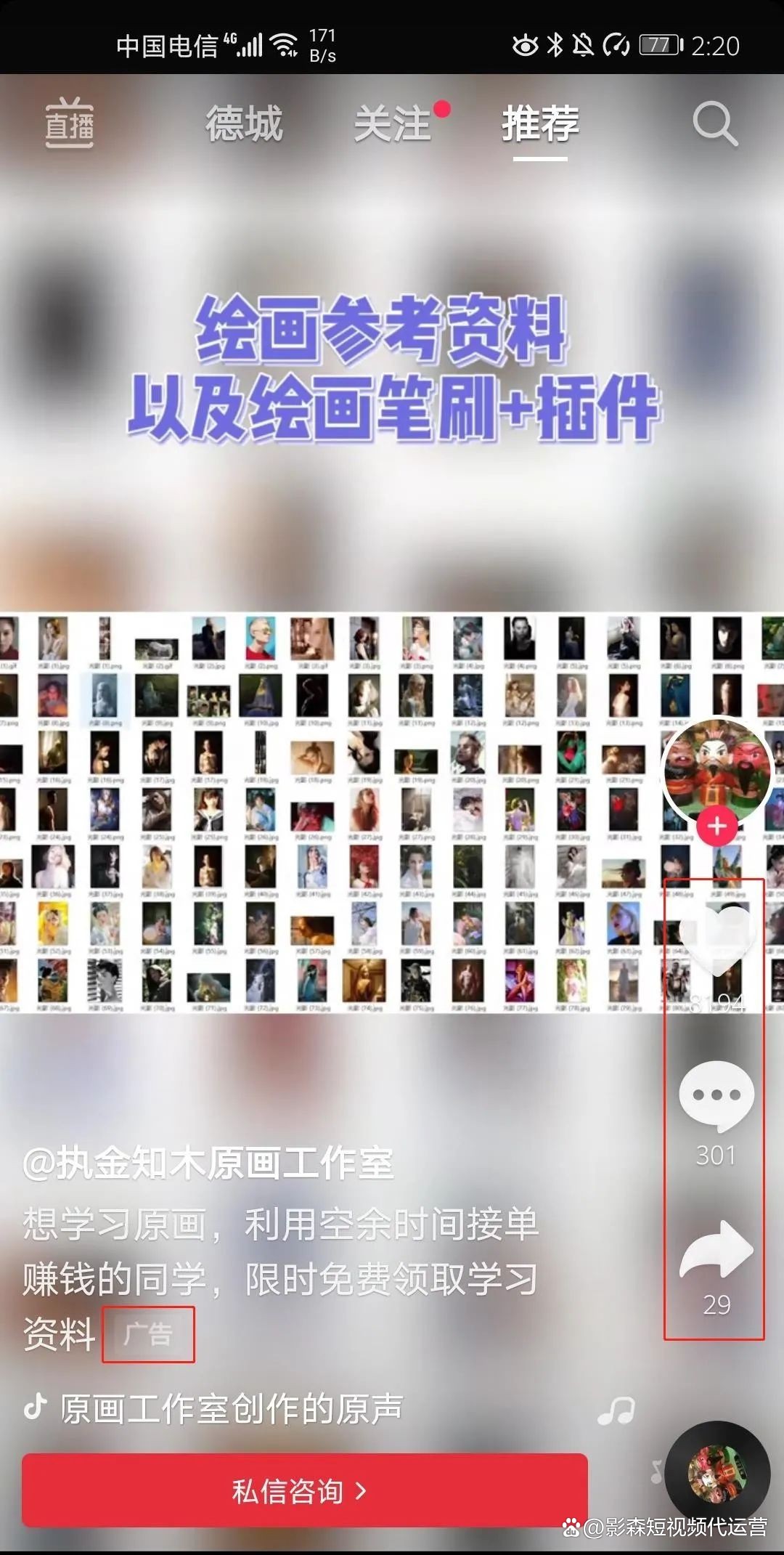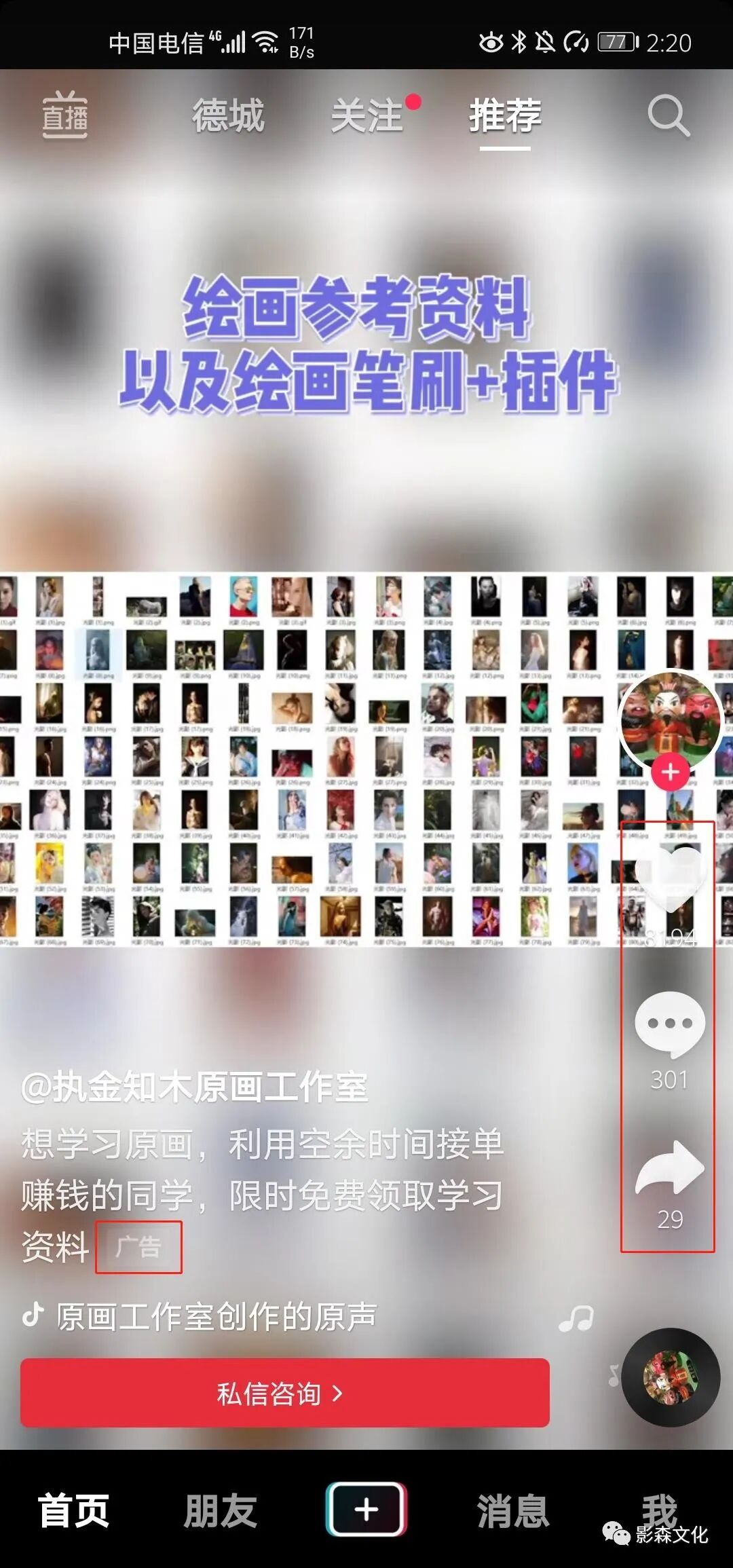抖音信息流广告,用户可以选择点赞、评论和分享